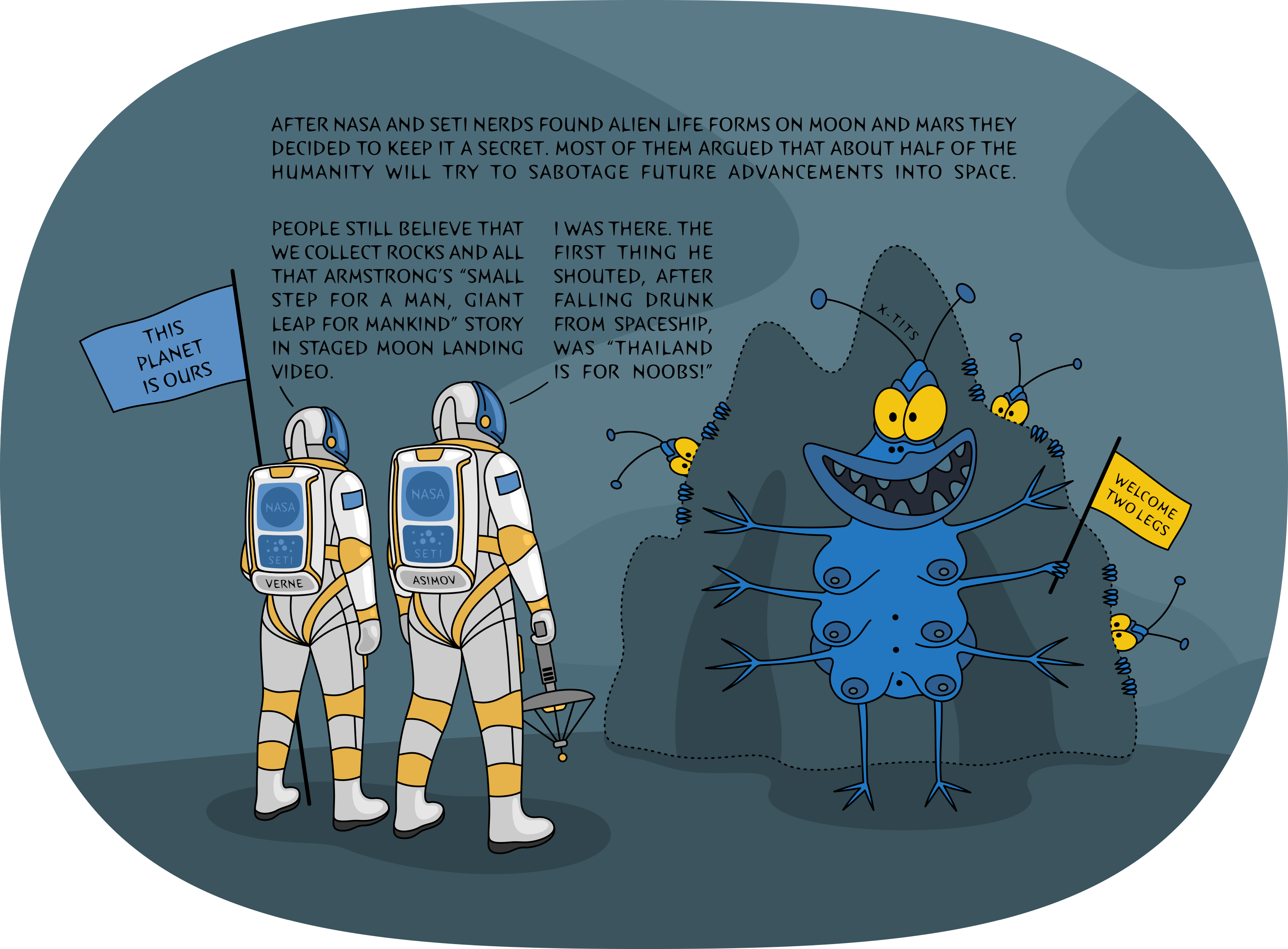 After NASA and SETI nerds found alien life forms on Moon and Mars they decided to keep it a secret. Most of them argued that about half of the humanity will try to sabotage future advancements into space.